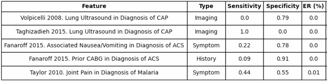 This table is a bit of a good example of where their study breaks down from “usable information” to “fun thought experiment”, demonstrating the limitations of their data source, relying upon citations where lung ultrasound gives either 0% sensitivity or 0% sensitivity, for example.