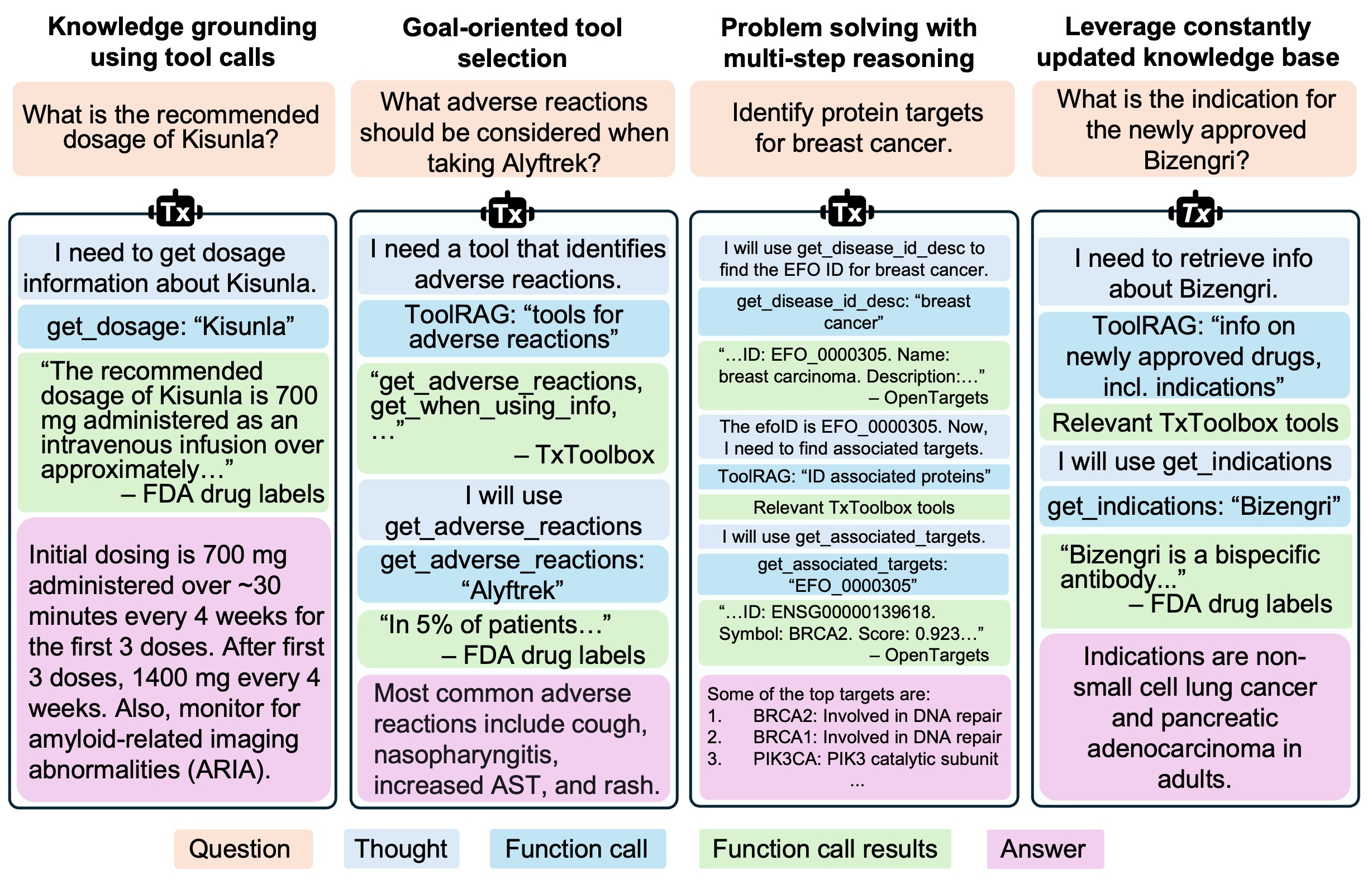 This is a Harvard/MIT demonstration project in which their “TxAgent” is designed to answer questions about medication use. In their agent, they’ve paired the LLM substrate with the ability to access 201 potential APIs across their “ToolUniverse”. The conceptual overview of the implementation is as follows:
