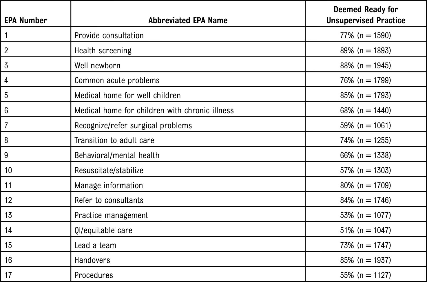 In this study published in Pediatrics, let’s see how faculty at pediatric training programs rated their trainees readiness for independent practice across 17 “entrustable professional activities”: